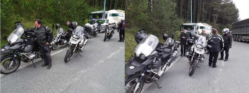 Zunächst gings für uns auf der GI-627 nach Norden in Richtung Donostia-San Sebastián. Bereits mit dem Abbiegen auf die GI-2630/GI-3520 über Onati, später in Richtung Zerain und dann auf der GI-2637 über Zegama, war das erste Kurvenfass der Tour aufgemacht. Aufgrund der nicht ganz optimalen Witterungsverhältnisse hielt man sich da noch zurück . . . noch. An einer größeren Rastanlage am Autobahnkreuz A-1/A-10 bei Altasau legte man kurz einen Stop ein, um die vergangenen Kilometer erstmal zu verdauen.